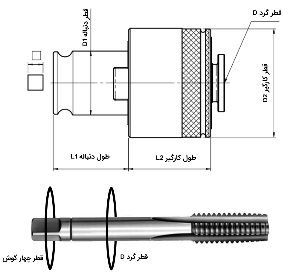 | کد | TC 820 JIS Tap | Tap Shank Total Shank Size | ظرفیت | طول دنباله L1 (mm) | طول کارگیر L2 (mm) | قطر دنباله ΦD1 (mm) | قطر کارگیر ΦD2 (mm) | ||