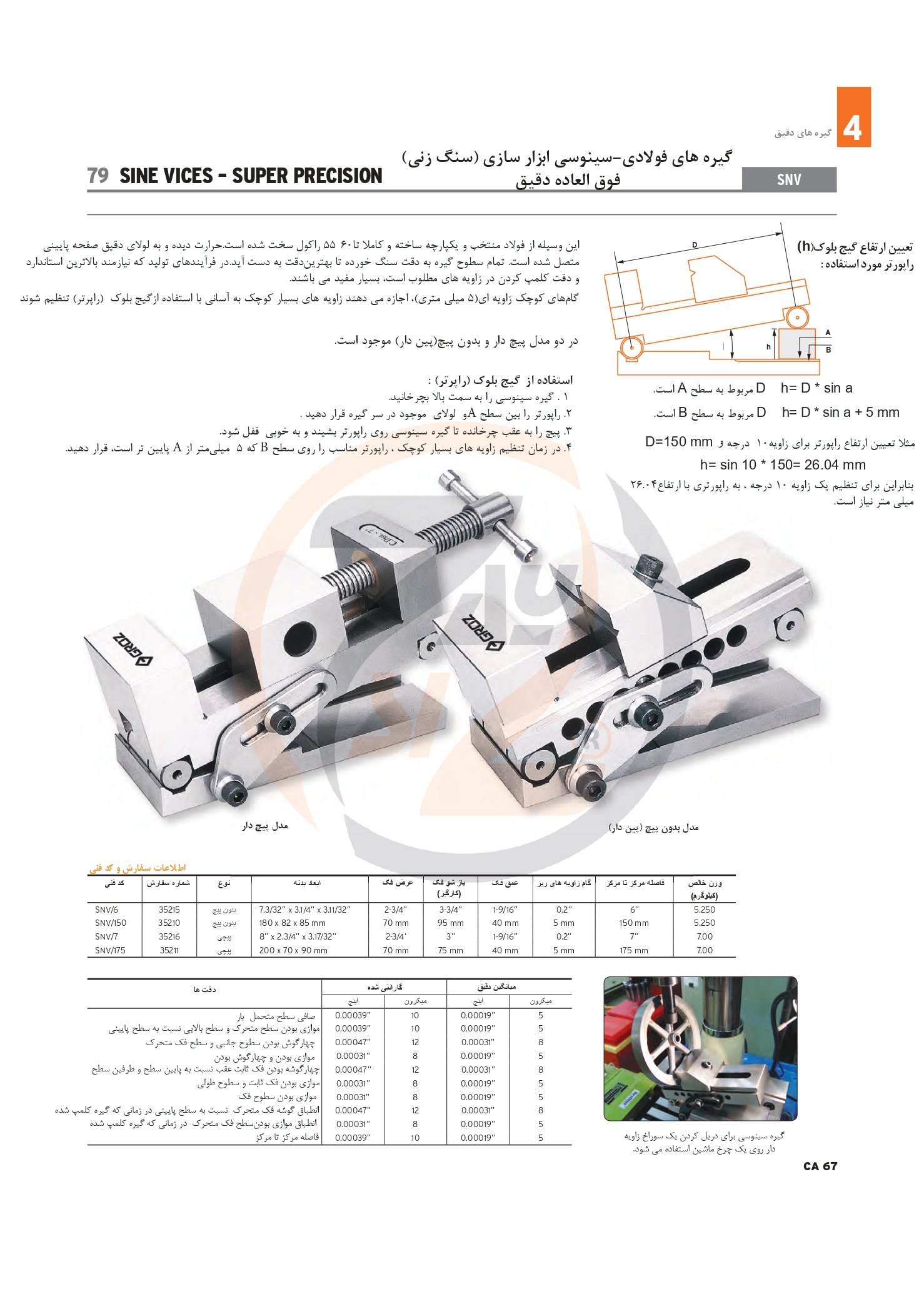 | توضیحات کوتاه محصول: | گیره فوق از نوع سینوسی (Sine Vices) زیر سنگ پین خور با عرض فک 7 سانتیمتر و کارگیر 9.5 سانتیمتر با وزن 5.2 کیلوگرم ساخت هند میباشد.گیره فوق تمام سنگ خورده و تمام گونیا میباشد. |