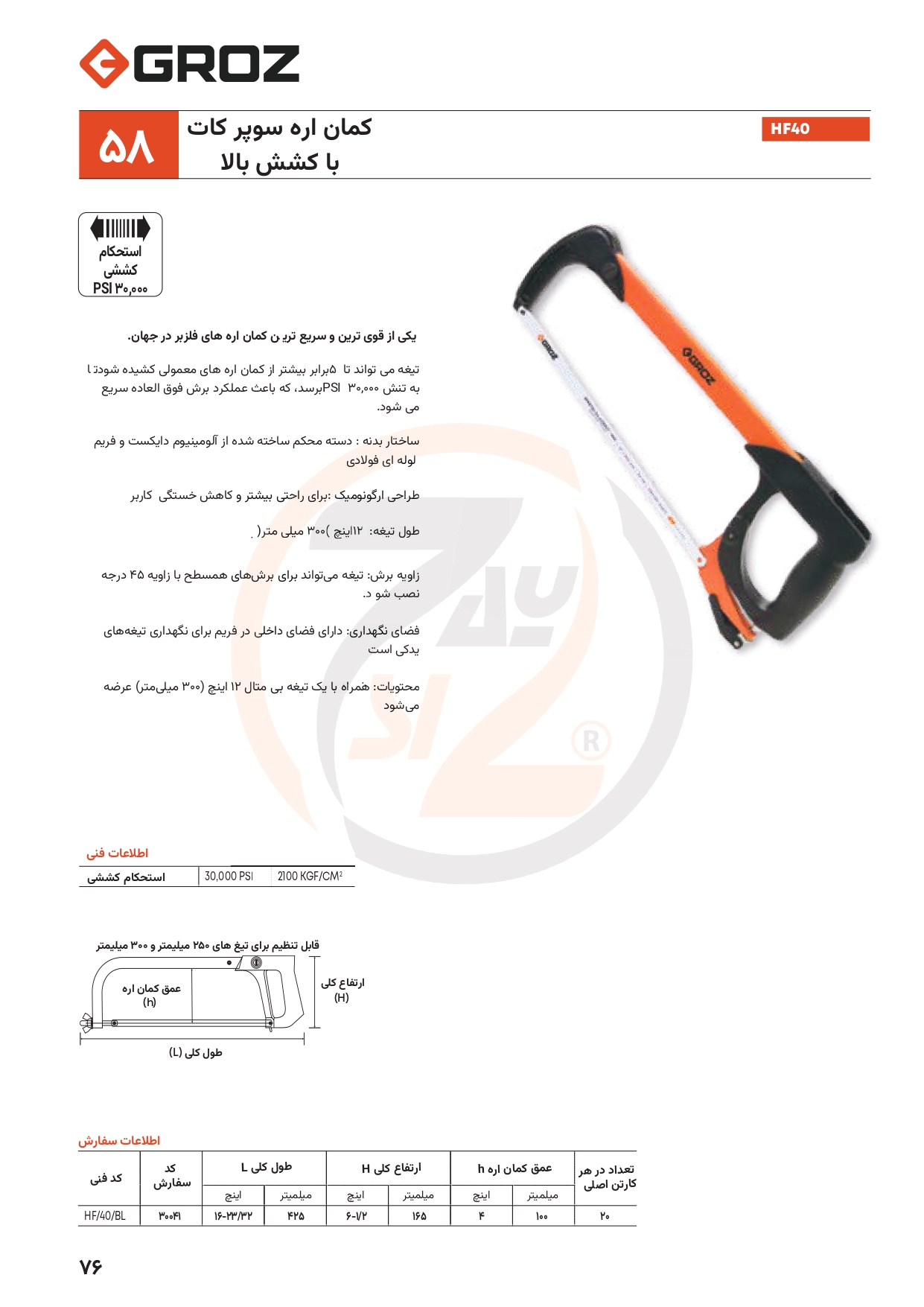 | عنوان محصول: | کمان اره دستی حرفه ای کد HF/40BL برند GROZ (گروز) |