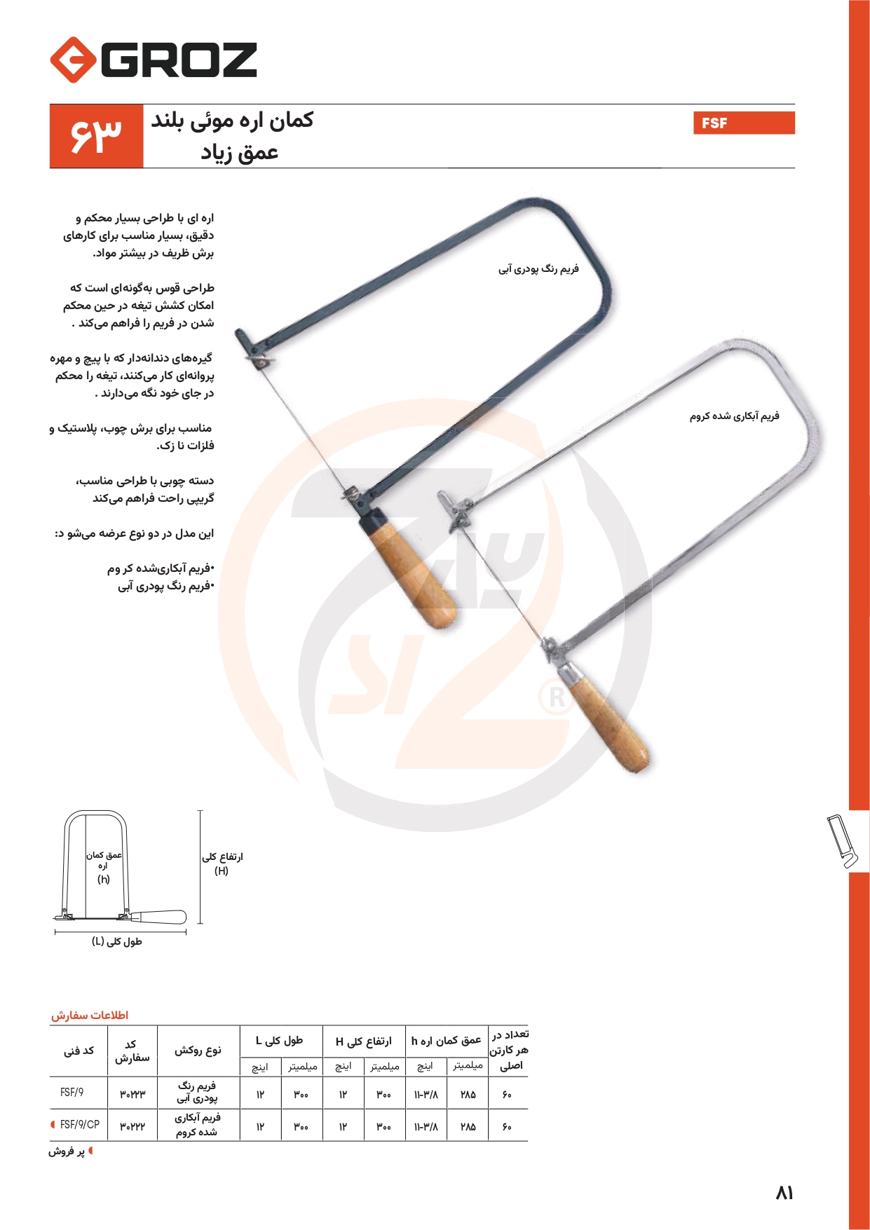 | عنوان صفحه: | کمان اره مویی عمق زیاد کد FSF/9/CP برند GROZ (گروز) |