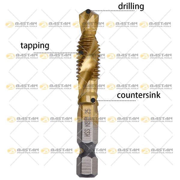 ابزار فوق ست قلاویز سر مته 6 عددی HSS میباشد، قلاویز سر مته فوق ابزاریست در جهت سوراخ کاری و دنده زنی همزمان بر روی قطعه کار.قلاویز سر مته فوق از فولاد ضد زنگ با روکش تیتانیوم HSS تولید شده و استحکام بالایی در دور بالا دارد.