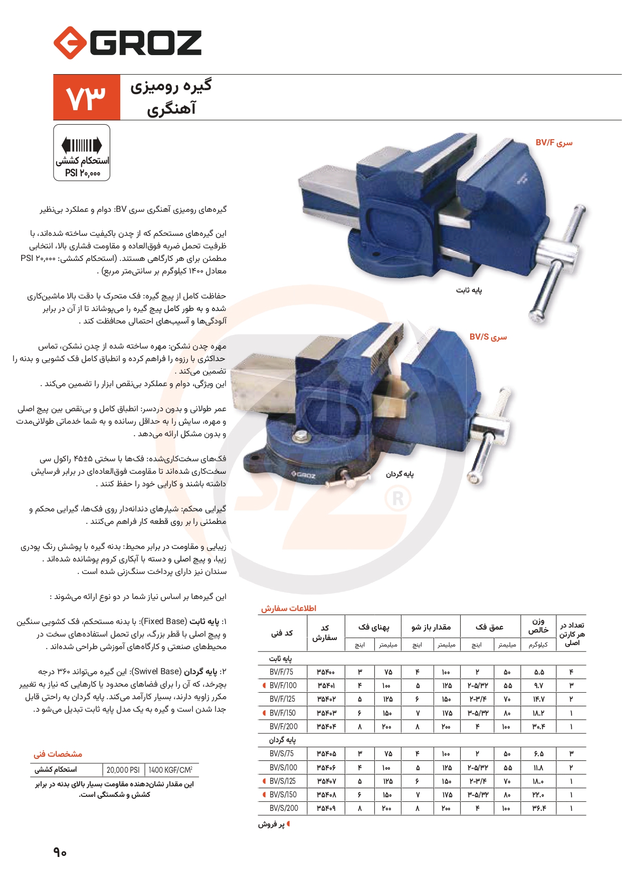 | عنوان محصول: | گیره رومیزی همراه با پایه گردان (فک فولادی) GROZ (گروز) سری BV/S ( در 5 سایز مختلف) |