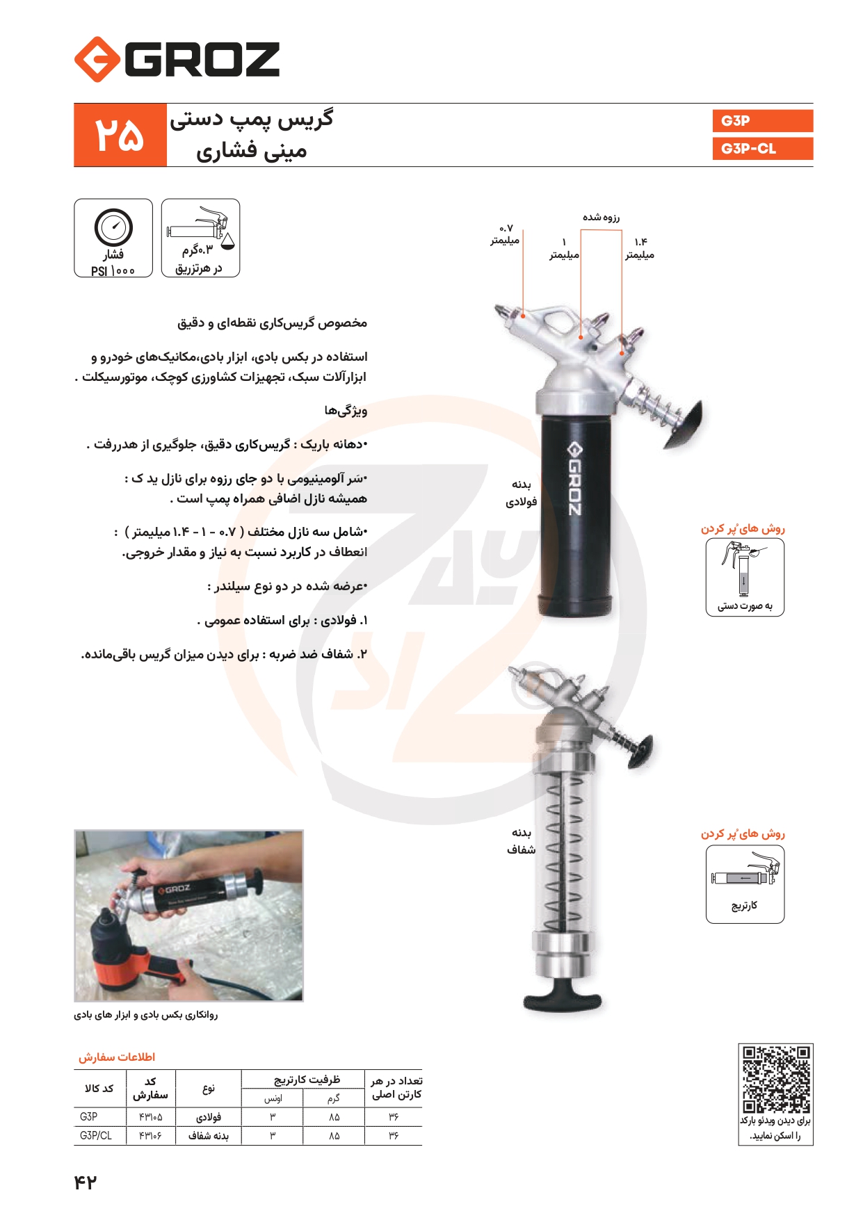 | عنوان صفحه: | مینی گریس پمپ دستی فشاری 85cc کد G3P برند GROZ (گروز) |