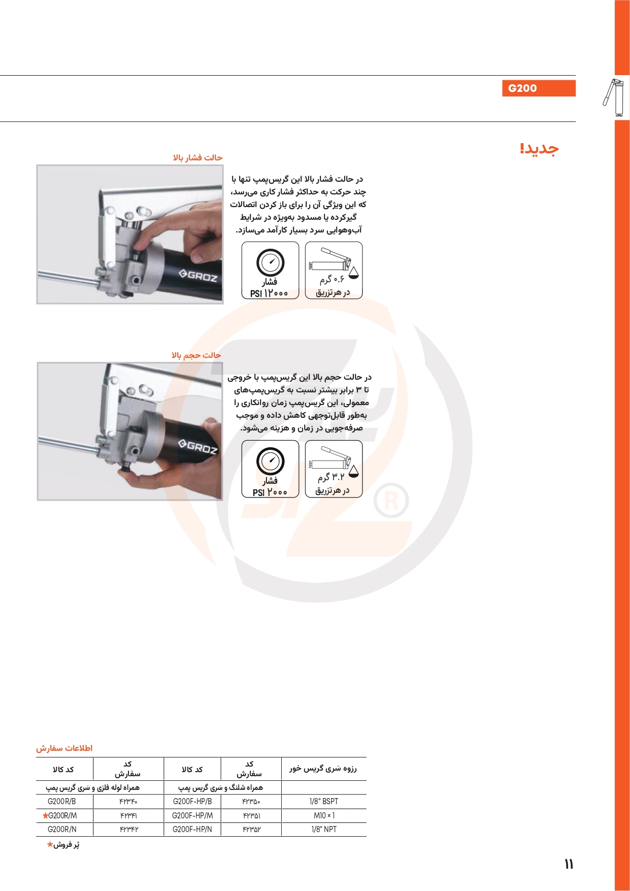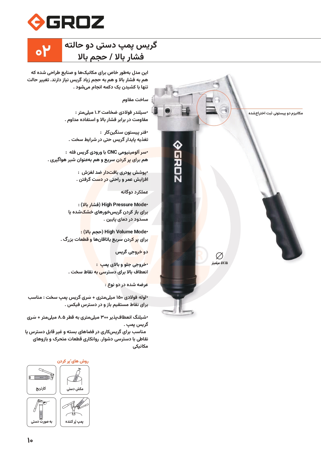 | عنوان صفحه: | گریس پمپ دستی دو حالته 500cc کد G200R/M برند GROZ (گروز) |
