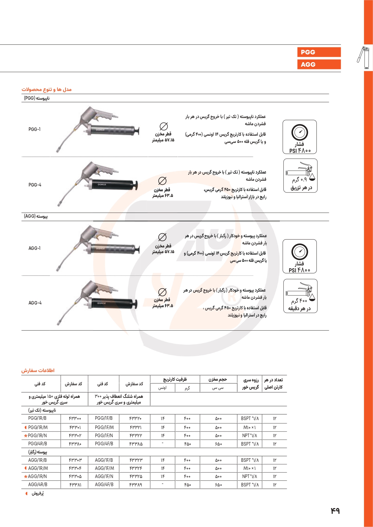 | توضیحات کوتاه محصول: | گریس پمپ فوق از نوع دستی بادی ظرفیت 500 سی سی مدل پیوسته (رگبار) با فشار 4800PSI و توان تخلیه 400 گرم در هر دقیقه کد AGG/1/R/M برند TAYSIS (GROZ) ساخت هند. |