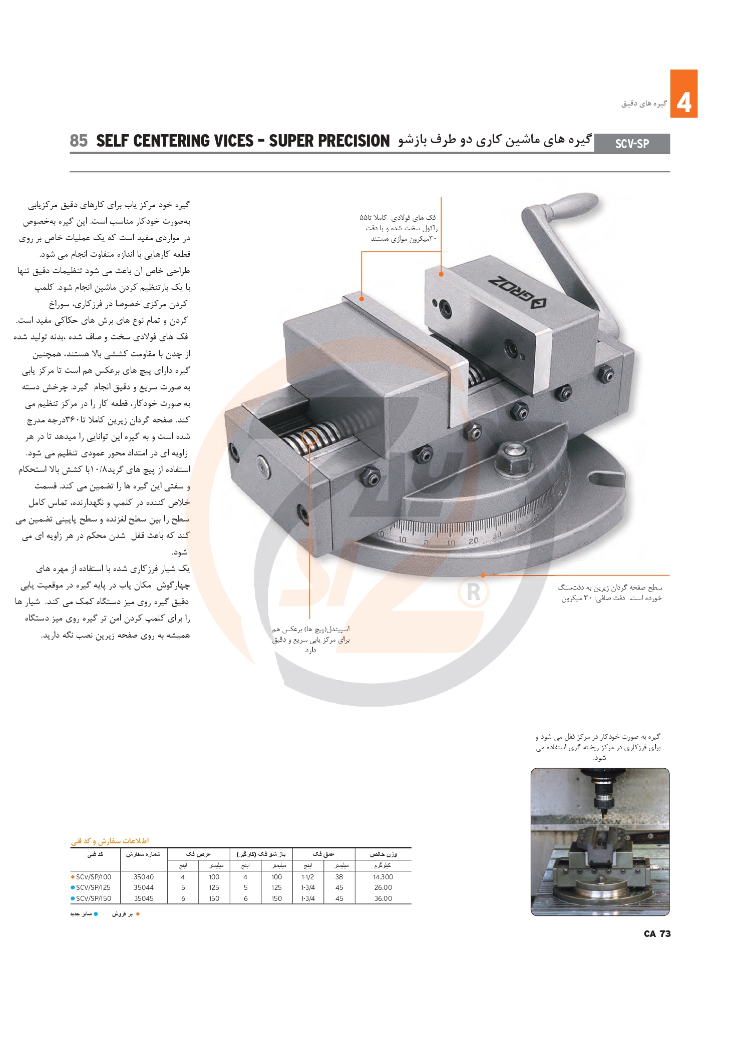 گیره زیر فرز گردان دو فک متحرک سری SCV/SP برند گروز (GROZ) (در 3 سایز) گیره فوق گیره زیر فرز گردان دو فک متحرک با قابلیت نگهداری قطعه در مرکز گیره میباشد، گیره فوق از وزن 14.3 تا 36 کیلوگرم با عمق فک 4 تا 4.5 سانت و کارگیر 10 تا 15 سانتیمتر ساخت هند.