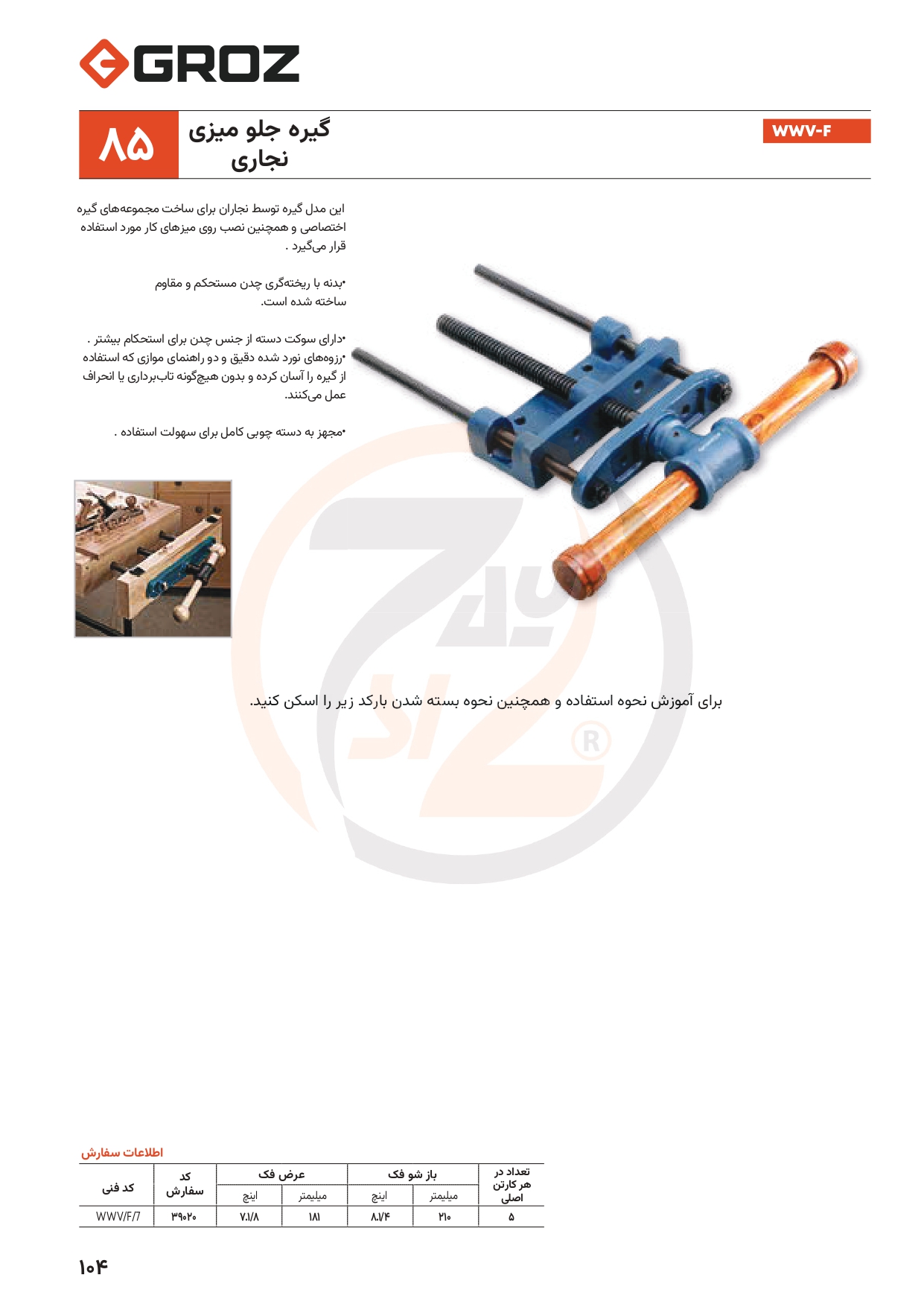 ویژگی ها گیره جلو میزی چوب کد WWV/F/7 برند گروز GROZ
