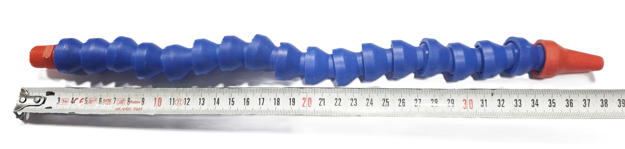 شیلنگ فوق آب صابون خور پلاستیکی بدون شیر 3/8 اینچ با طول نزدیک به 38 سانتیمتر و سایز رزوه 16.39 میلیمتر و سایز خروجی 8.21 میلیمتر ساخت ایران.